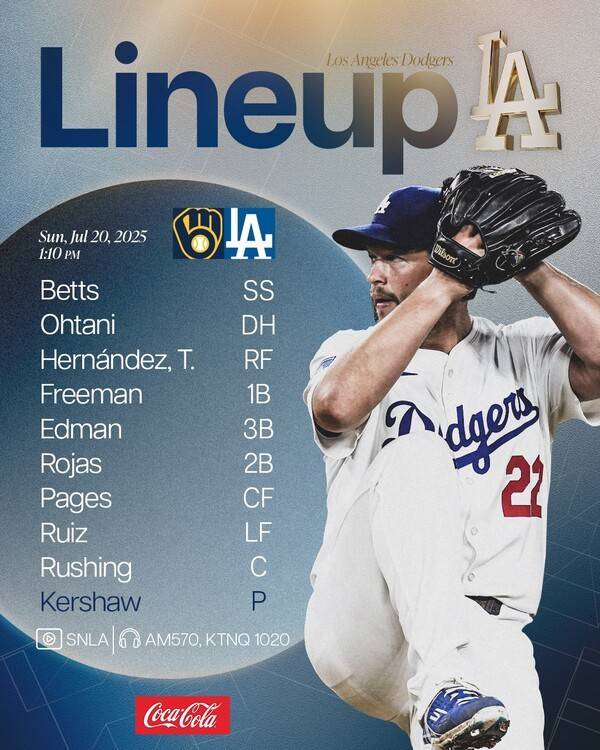 다저스는 무키 베츠(유격수)-오타니 쇼헤이(지명타자)-테오스카 에르난데스(우익수)-프레디 프리먼(1루수)-토미 에드먼(3루수)-미겔 로하스(2루수)-앤디 파헤스(중견수)-에스테우리 루이스(좌익수)-달튼 러싱(포수) 순으로 타순을 꾸렸다. 선발 투수는 클레이튼 커쇼다.