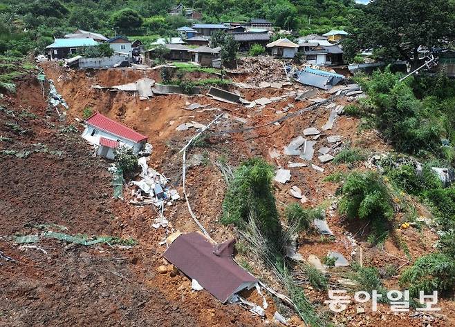 | 무너진 산청마을 20일 경남 산청군 생비량면 상능마을의 주택들이 산사태 토사물에 휩쓸려 내려가 있다. 이번 집중호우로 인한 산사태 피해가 산청군과 경기 가평군 등에 집중됐지만 사망자가 발생한 지역은 산림청이 지정하는 ‘산사태 취약지역’이 아니었던 것으로 나타났다. 산청=박형기 기자 oneshot@donga.com |