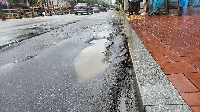 차 바퀴에 짓눌린 부분은 움푹 패어 빗물이 고였고, 제 자리에서 밀려난 아스팔트는 길가 배수시설 안으로 들어가다가 멈춘 듯한 모습이었습니다.