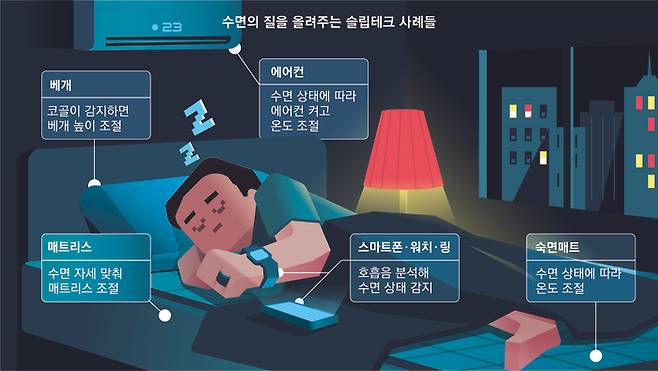 대기업들도 앞다퉈 숙면 시장에 뛰어들고 있다. 삼성전자는 올해 출시한 에어컨 신제품에 ‘굿슬립’ 모드룰 추가했다. 갤럭시 워치, 갤럭시 링과 연동해 사용자의 수면이 감지되면 에어컨을 자동으로 작동시키고 온도를 조절해준다. 또 기상 알람 시간에 맞춰 별도로 조작하지 않아도 에어컨 운전이 자동 종료된다. 현대건설은 에이슬립 수면 데이터 분석 기술을 활용해 주거 공간 전체를 스마트하게 제어하는 ‘헤이슬립(Hey, Sleep)’ 솔루션을 공동 개발했다. 온도·습도·공기 질·조명 등을 통합적으로 관리해 사용자의 수면 상태에 따라 자동으로 최적의 환경을 조성한다.