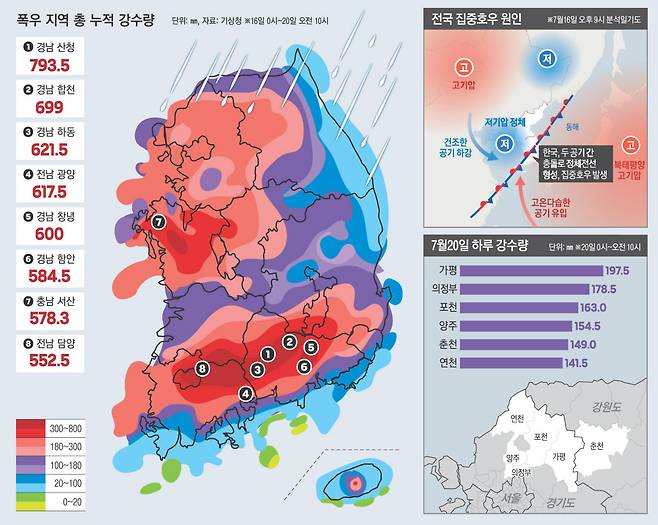 10명이 숨지고 4명이 실종된 경남 산청군도 짧은 시간 감당하기 힘든 물폭탄이 쏟아졌다. 지난 17일 산청에는 1시간 기준 101.0㎜가 내렸다. 100년에 한 번 내릴 법한 수준의 비다. 19일에는 50년 빈도 강우량(1시간 기준·98.5㎜)을 기록했다. 닷새 동안 산청에 쏟아진 비는 총 793.5㎜에 달한다.