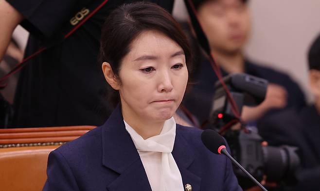 | 입 다문 강선우 강선우 여성가족부 장관 후보자가 지난 14일 서울 여의도 국회에서 열린 여성가족위원회 인사청문회에서 의원 질의를 듣고 있다. 허정호 선임기자 |
