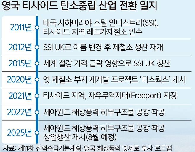 알렉 브라운 영국 레드카앤클리블랜드(Redcar & Cleveland) 자치구 의회 대표는 이같이 말하며 “최근 들어 해상풍력 공급망 등 탄소중립 산업 유치로 우리 지역이 점차 되살아나고 있다”고 말했다. 레드카앤클리블랜드·미들즈브러 등 5개 자치구로 구성된 티사이드는 20세기 중반까지 철강산업을 중심으로 한 세계적인 중공업 도시로 영광을 누리다 1980년대 들어 전 세계 시장에서 경쟁력을 잃으면서 대다수 업체가 문을 닫거나 외국계 기업에 팔려나가기 시작했다. 특히 2011년 태국 철강업체인 SSI가 레드카 지역 제철소를 인수해 가동을 시작한 SSI UK 파산은 실업률 급등·상권 침체 등 지역사회에 씻을 수 없는 상처를 남겼다.