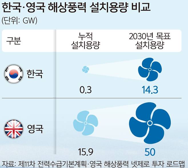 지난달 26일 영국 티사이드(Teesside) 지역 내 티스웍스(Teesworks) 산업단지. 이 산단 관계자가 한국 기자들에게 주차장 너머로 누워 있는 해상풍력 하부구조물 자재 수십개를 가리키며 말했다. 직경이 성인 키 5∼6배는 되는 이들 자재 단면에는 모두 제조사인 ‘GE 버노바’가 적혀 있었다. 미국 기업 GE의 에너지 전문 계열사인 GE 버노바는 북해 해상에 조성 중인 도거뱅크 단지에 주요 부품을 공급해 오고 있다.