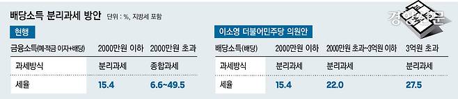 이 의원안은 배당 성향이 35% 이상인 상장법인에서 받는 배당소득의 최고세율을 현행 49.5%에서 27.5%로 낮추는 내용이다. 배당소득 2000만원 이하엔 현행(15.4%)대로, 2000만원 초과~3억원 이하엔 22%, 3억원 초과에 27.5%의 별도 세율을 적용하는 안이다. 현재는 주식 배당·이자 등 금융소득이 연 2000만원을 초과하면 종합소득세 대상으로 분류돼 최고 49.5%의 누진세율을 적용받는다. 이 의원안대로라면 배당 소득이 3억원을 넘을 경우 세율이 현재보다 최대 22%포인트가량 줄어든다.