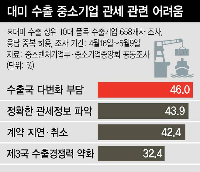 실제 지난 4∼5월 중소벤처기업부 등이 수출 상위 10대 품목 중소기업 658곳을 대상으로 설문조사한 자료를 보면 미국의 관세 정책에 따른 가장 큰 어려움(중복 응답 허용)으로 ‘수출국 다변화 부담’(46.0%)이 꼽혔고, 이어 ‘정확한 관세 정보 파악’(43.9%), ‘계약 지연·취소’(42.4%), ‘제3국 수출 경쟁력 약화’(32.4%) 등이 뒤를 이었다. 관세 자체만큼이나, 통상 환경 변화의 불확실성이 혼란과 비용을 초래하고 있다는 뜻이다.