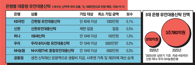 반면 유언대용신탁은 유언장과 같은 법적 효력을 갖췄으면서도 살아 있을 때부터 재산을 굴릴 수 있고, 계약서만 고쳐 쓰면 손쉽게 내용 변경이 가능해 고령층 고액자산가 사이에서 인기가 많다.