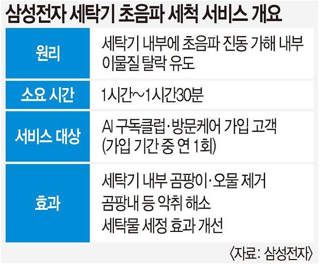삼성전자서비스는 ‘삼성 AI 구독클럽’과 연계해 이 서비스를 확대 제공하고 있다. 기존 방문케어 상품에 가입한 고객에게만 구독 기간 중 1회에 한해 제공했지만, 이제는 구독 기간 중 연 1회 제공 가능하다. 삼성전자서비스 관계자는 “서비스 확대 이후 초음파 세척 이용 건수가 15% 이상 증가하고 서비스 만족도도 20% 향상됐다”고 말했다.