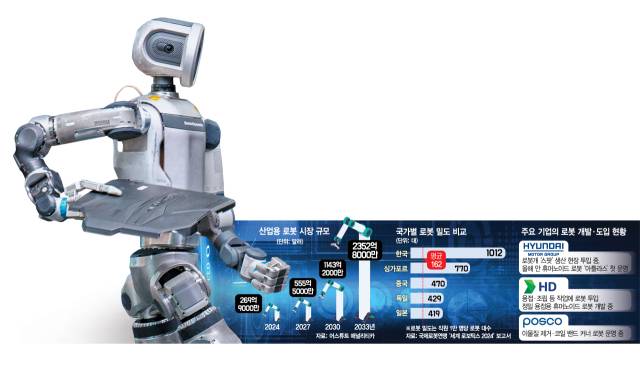 이미 투입된 산업용 로봇의 데이터도 많다. 국제로봇연맹이 발간한 ‘세계 로보틱스 2024’ 보고서에 따르면 한국은 직원 1만 명당 로봇 1012대를 도입해 로봇 밀도에서 1위를 차지했다. 2위 싱가포르(770대), 3위 중국(470대), 4위 독일(429대), 5위 일본(419대)과 격차도 크다.