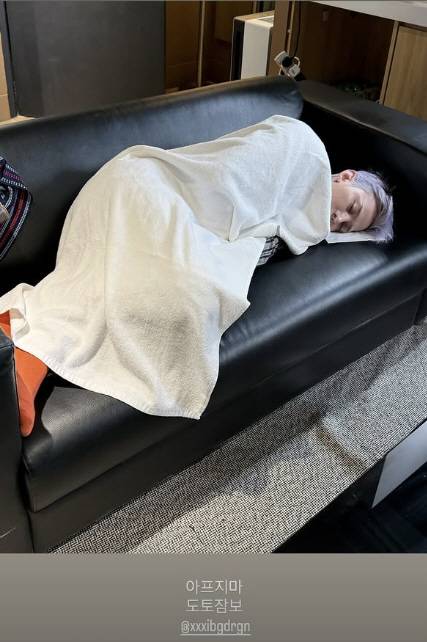 공개된 사진에서 지드래곤은 큰 수건으로 몸을 감싼 채 소파에 누워 잠든 모습이다.