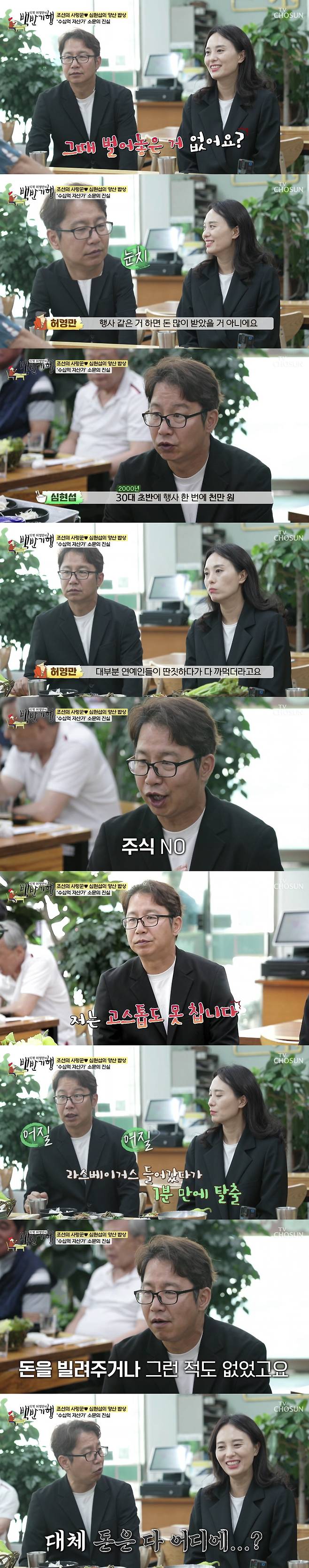 심현섭은 "2000년 30대 초반에 행사 한번에 천만원 받았다"며 전성기 시절을 떠올려 놀라움을 자아냈다.