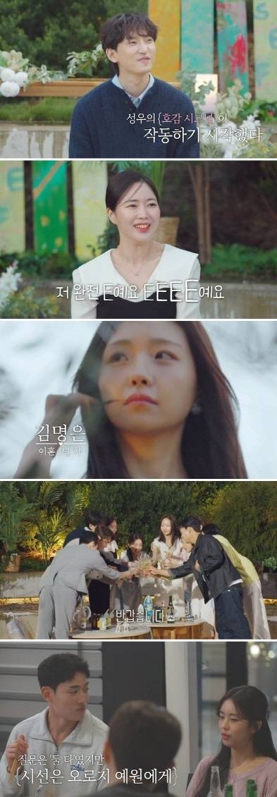 네 번째 돌싱인 ‘이혼 6년 차’ 성우는 먼저 와있던 돌싱들과 대화를 나누다, 제작진과 미리 약속한 호감 시그널인 ‘주먹 꽉’ 제스처를 취했다. 이를 포착한 이지혜는 “예원-지우 중 마음에 드는 사람이 있다는 것”이라며 과몰입을 시작했다.