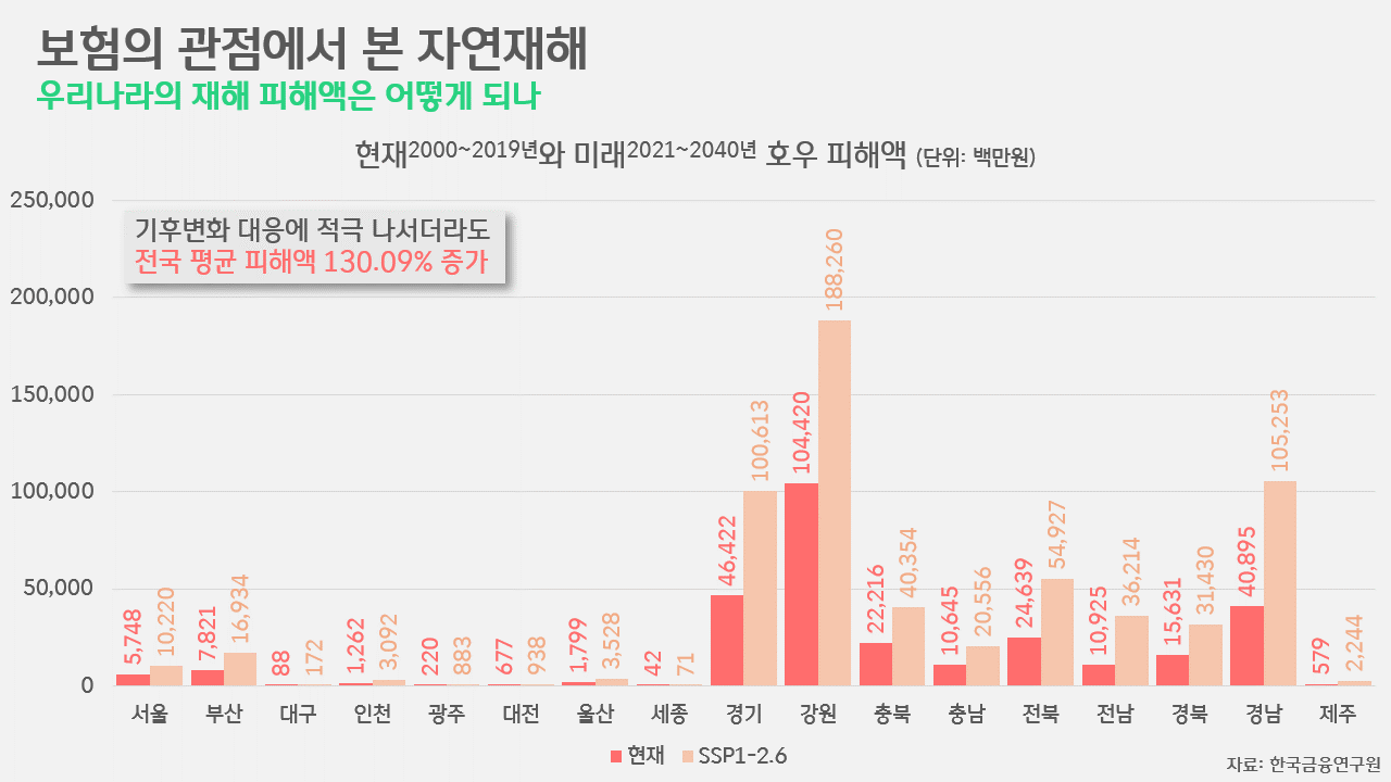 한국금융연구원은 지난 6월, 〈기후변화에 따른 물리적 위험이 보험산업에 미치는 영향과 과제〉라는 보고서를 통해, 향후 호우로 인한 피해액을 전망했습니다. 우리가 지금 당장 온실가스 감축에 적극 나서는 상황을 가정한 시나리오인 'SSP1-2.6 시나리오'에 따르더라도, 가까운 미래(2021~2040년)에 전국의 호우 피해액은 현재(2000~2019년)보다 130% 넘게 늘어날 것으로 나타났습니다. 2000~2019년, 전국 평균 173억원 가량의 호우 피해액을 기록해왔는데, 2021~2040년엔 이 금액이 362.2억원으로 늘어난다는 겁니다.