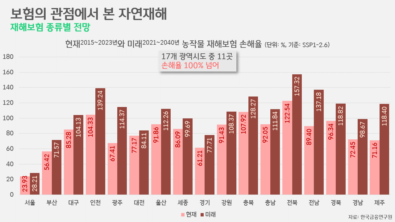 농작물·가축의 재해보험의 손해율이나 풍수해보험의 지급 보험금 또한 커질 수밖에 없습니다. 최선을 다해 기후변화 대응에 나선다고 하더라도, 예년 수준으로 그 피해 정도를 줄이기엔 많은 시간이 걸리기 때문입니다. 농작물 재해보험의 경우, 현재(2015~2023년 평균) 전국 17개 광역시도 가운데 인천(104.33%)과 충북(107.92%), 전북(122.54%)에서 이미 손해율이 100%를 넘은 상태입니다. SSP1-2.6 시나리오에 따르면, 당장 2021~2040년 사이 손해율이 100%를 넘어서는 광역시도는 11곳으로 급증할 전망입니다. 손해율이 가장 높은 곳은 전북(157.32%), 인천(139.24%), 전남(137.18%)으로 꼽혔습니다. 우리나라의 농경지가 상대적으로 서쪽지역에 많을뿐더러, 호우로 인한 피해 역시 대체로 서쪽 지역에 집중되어온 결과로 풀이됩니다.
