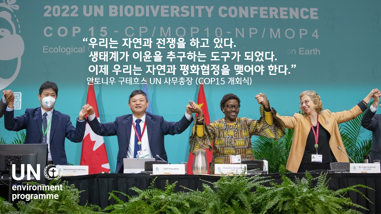 온실가스의 감축은 결국 이런 위험으로부터 우리를 지키기 위한 방법론 중 하나입니다. 궁극적으론 생태계의 일원으로서 우리 인류가 '공존의 길'을 찾아야만 하는 것이죠. 지난 2022년 12월, 제15차 유엔생물다양성협약 당사국 총회(COP 15) 개회식 당시 안토니우 구테흐스 유엔 사무총장이 “우리는 자연과 전쟁을 하고 있다. 생태계는 이윤을 추구하는 도구가 됐다. 이젠 자연과 평화협정을 맺어야 한다”고 강조한 이유입니다. 온실가스 감축이라는 어젠다의 '상위 버전', 바로 생물다양성의 보전입니다.