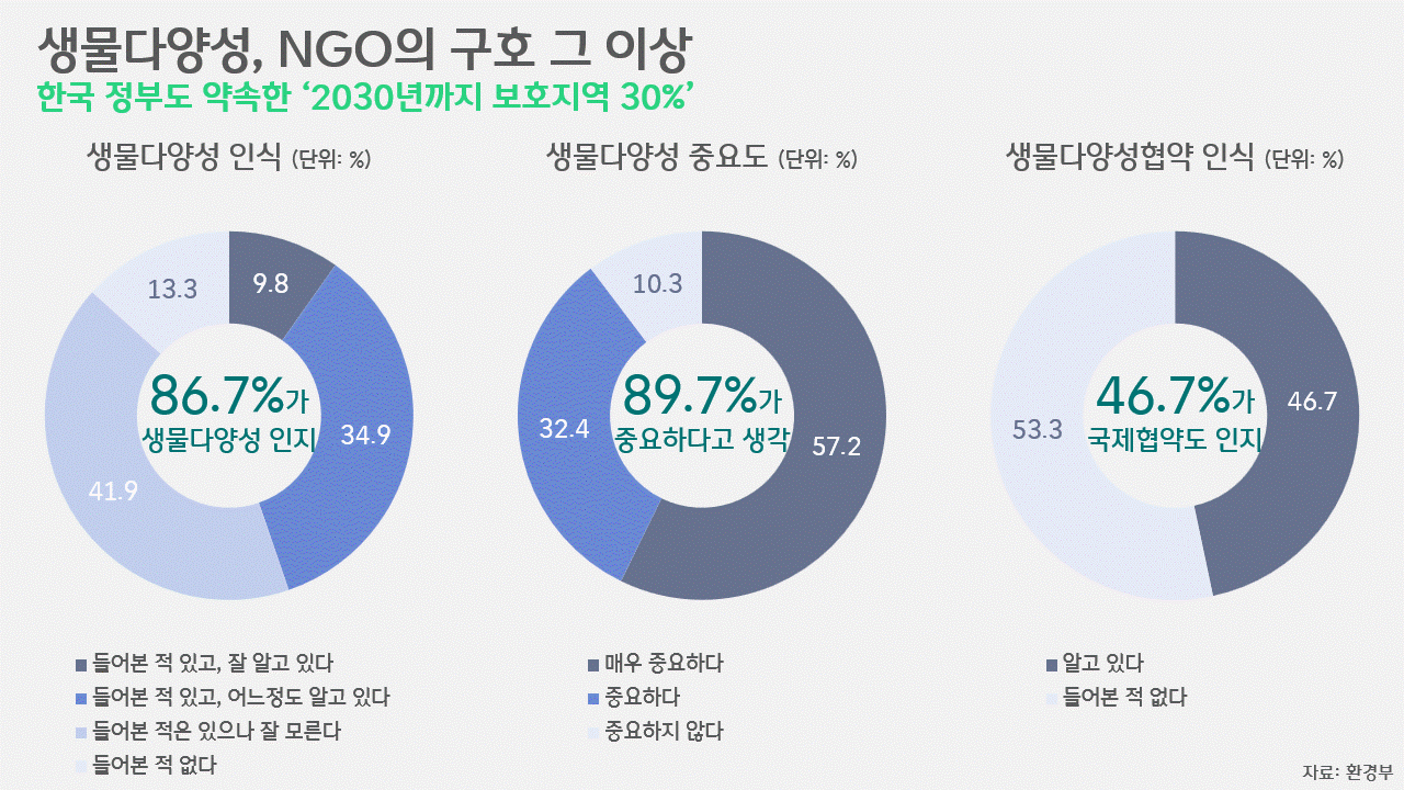 얼핏, 그래도 열의 아홉이 알고 있고, 중요하다고 했으니 '이 정도면 충분한 것 아닌가' 싶을지 모르겠습니다. 그러나 이를 뜯어보면, 생물다양성을 명확히 인지하고 있는 이는 10%가 채 되지 않고, 여전히 10명 중 1명은 이것이 중요하다고 생각하지 않는다는 뜻이기도 합니다. 협약에 대한 인식의 경우에도, 기후변화협약의 인지도(75.2%)에는 크게 못 미칩니다. 2030년 온실가스를 40% 줄여야 한다는 점은 알지만, 보호지역을 30%로 늘려야 한다는 것은 모르는 경우가 대부분이니까요.