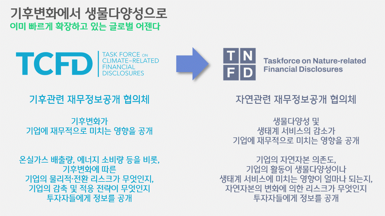 “생물다양성이 대수냐”, “온실가스 감축도 모자라서 이젠 보호지역이냐”… 이런 거부감과 함께 신속한 대응이 늦춰진다면, 이는 결국 우리의 피해로 돌아올 수밖에 없습니다. 온실가스 감축과 에너지전환을 하대하다 산업과 경제분야에서 '30년 전부터 예견됐음에도 발등에 불 같은' 타격을 입은 것처럼요. 우리가 이름을 알 만한 기업은 거의 대부분 기후관련 재무정보를 해마다 공개하고 있습니다. TCFD(Task force on Climate-related Financial Disclosures, 기후관련 재무정보공개 협의체)의 권고에 따른 결과입니다. 그저 지출과 매출, 이익만을 공개하는 것이 아니라, 기업이 기후변화에 미치는 영향, 반대로 기후변화로 기업이 받는 영향 등을 해마다 공개하는 것이죠. 이는 '최신 트렌드'가 아닙니다. 상당 기간, 다수의 기관과 기업들이 참여해오며 '글로벌 스탠다드'로 자리 잡은 지 오래입니다.