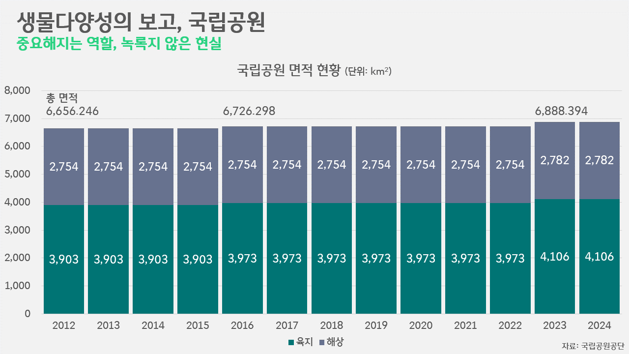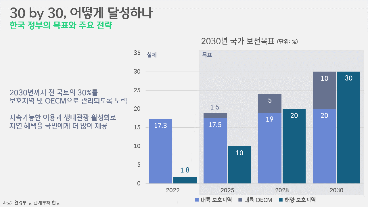많은 이들이 유엔기후변화협약 당사국으로서 한국이 파리협약을 비롯한 각종 국제사회의 약속에 동참한 것을 알고 있습니다만, 유엔생물다양성협약 당사국으로서도 아주 중요한 약속에 동참했다는 점은 잘 알지 못합니다. 최근 5년간의 세월만 놓고 보더라도, 2021년 우리나라는 P4G 정상회의를 개최하면서 '생물다양성 보호지역 확대 연합'에 동참했고, 2022년 열린 COP 15에서 채택된 GBF(Global Biodiversity Framework, 글로벌 생물다양성 프레임워크)에 합의했습니다. 2030년까지 최소 30%의 면적을 보호지역이나 OECM(Other Effective Area-based Conservation Measure, 자연공존지역)으로 설정하겠다는 약속입니다. 당시 전 세계 내륙의 16.98%와 해양의 9.26%가 이에 해당했던 만큼, 30%라는 숫자는 매우 도전적인 숫자입니다.