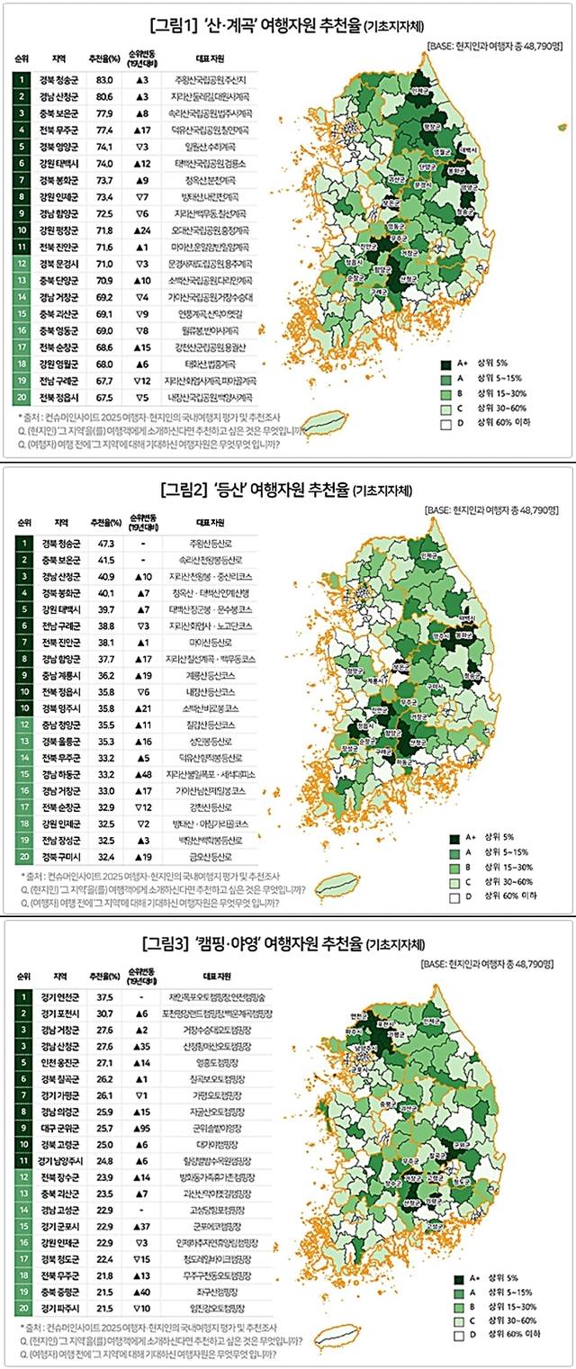 보고서는 “청송을 1위로 산청과 보은은 순위만 바뀌었을 뿐 ‘산·계곡’과 ‘등산’ 2개 항목은 ‘톱(TOP)3’ 지자체가 동일했다”며 “이들 지자체를 포함해 6곳의 지자체가 2개 항목 모두 10위 안에 이름을 올렸고, 이는 기본적으로 산을 배경으로 하는 여행 활동이라는 공통점 때문”이라고 설명했다.