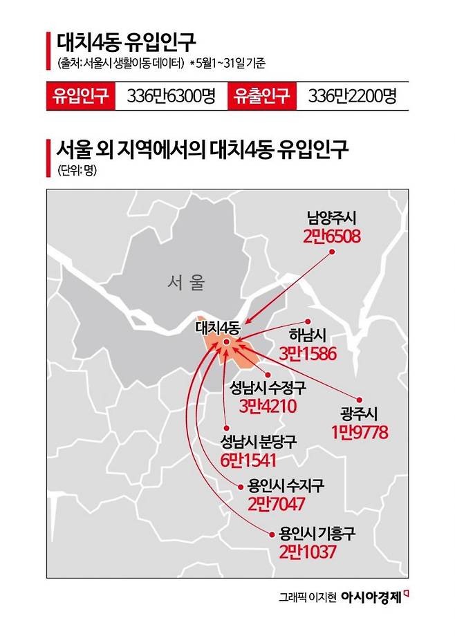 대치4동의 경우 지난 5월 약 336만명(유입 336만6300명, 유출 336만2200명)이 오갔다. 주로 서초구·송파구 등 인근 지역에서 이동이 이뤄졌지만 하남시(3만1586명), 성남시 수정구(3만4210명), 광주시(1만9778명), 용인시 기흥구(2만1037명), 남양주시(2만6508명) 등 경기 지역에서도 인구 유입이 활발했다.