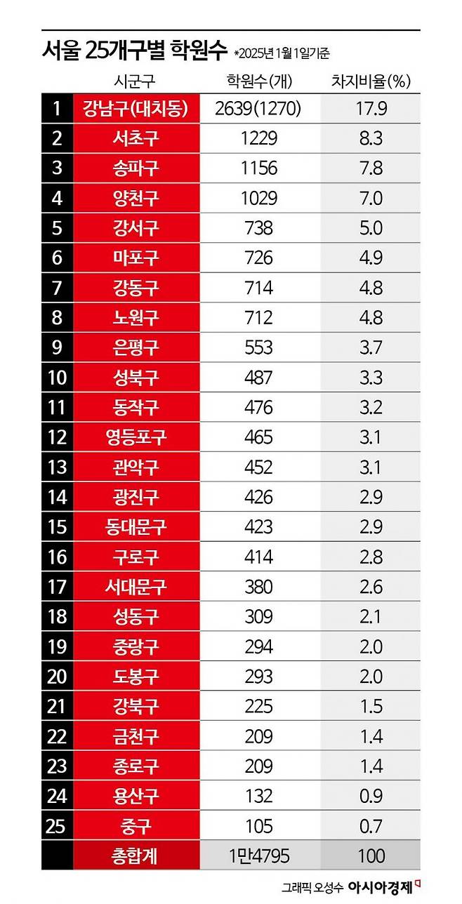 최근에는 지하철 연장, 수서고속철도(SRT) 신설 등으로 서울 외곽 지역에서 강남 대치동 학원가로 오는 학생이 크게 늘었다. 대치동에는 강남구(2639개)의 절반가량인 1270개의 학원이 몰려 있다. 학원 수가 가장 적은 중구(105개)와 비교하면 12배에 달하는 규모다.