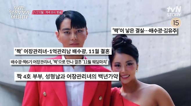 바로 오늘 7월 21일(월) 저녁 8시, tvN STORY에서 방송되는 부부 고민 거울 치료 드라마 테라피 '우리는 잉꼬부부가 아닙니다' 4회에는 인기 예능 '짝'에 출연한 것이 인연이 되어 결혼까지 골인한 배수광, 김유주 부부가 출연, 깜짝 놀랄 반전 근황을 공개해 궁금증을 증폭시킨다.
