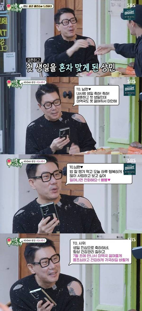 이상민은 파리 촬영이 아내를 만나기 전에 결정된 스케줄이라며 "오늘이 내 생일이다. 아침에 아내한테 문자가 왔다"고 자랑했다. 메시지 속 아내는 “내 사랑 생일 축하! 결혼하고 첫 생일인데 미역국도 못 끓여줘서 미안해. 밥 잘 챙겨먹고 오늘 하루 행복하게 보내. 많이 사랑하고 보고 싶어. 일어나면 전화해요”고 써 있었다.