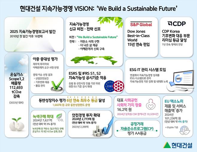 현대건설은 지속가능경영을 위한 노력과 성과, 신규 전략과 실행 과제 등을 담은 2025 지속가능경영보고서를 발행했다고 21일 밝혔다.