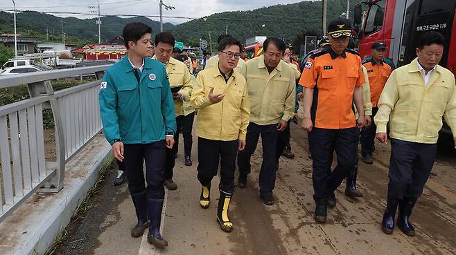 ▲ 김동연 경기도지사(왼쪽에서 두번째)가 20일 경기도 가평군 상면 대보교 수해 현장을 둘러 보고 있다.