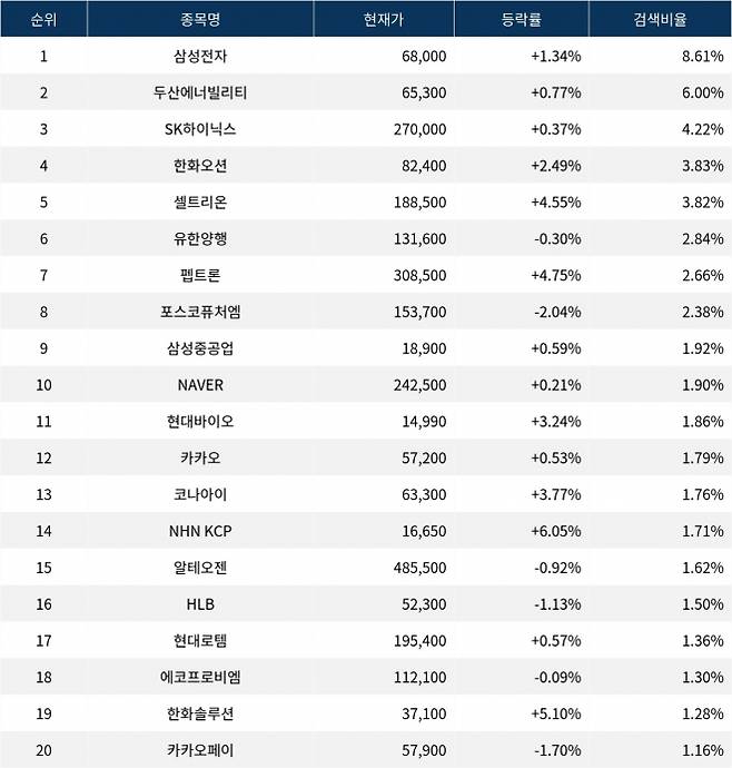 이어 두산에너빌리티(034020)가 검색비율 2위를 기록하며 0.77%의 상승세를 기록하고 있다. 검색비율 3위의 SK하이닉스(000660)는 0.37% 상승하며 순조롭게 출발하는 모습이다. 검색비율 4위 한화오션(042660)은 개장 초반부터 2.49%의 상승률을 보이고 있다. 검색비율 5위 셀트리온(068270)은 4.55% 상승하며 강세를 보이고 있다.