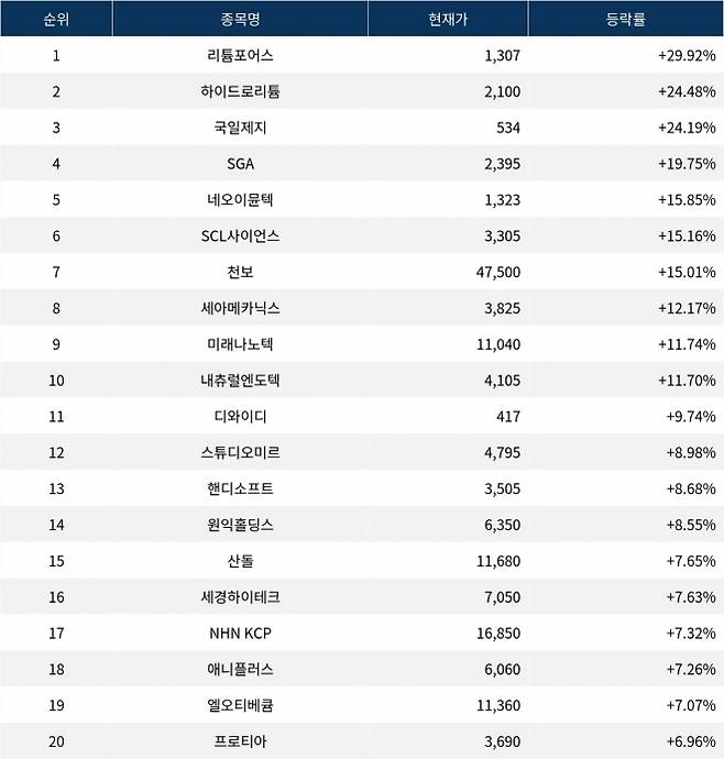 6위 SCL사이언스(246960)는 현재가 3,305원으로 15.16% 급등 중이다. 7위 천보(278280)는 현재가 47,500원으로 15.01% 급등 중이다. 8위 세아메카닉스(396300)는 현재가 3,825원으로 12.17% 급등 중이다. 9위 미래나노텍(095500)은 현재가 11,040원으로 11.74% 급등 중이다. 10위 내츄럴엔도텍(168330)은 현재가 4,105원으로 11.70% 급등 중이다.