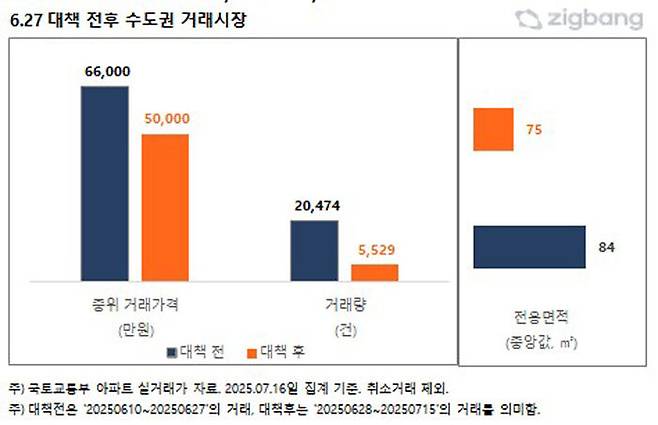 오늘(21일) 부동산 플랫폼 직방이 6월 10일부터 7월 15일까지의 국토교통부 실거래가 자료를 분석한 결과 대책 발표 전 수도권 아파트의 중위 거래가는 6억 6천만 원, 전용면적은 84㎡였으나 발표 이후에는 각각 5억 원, 75㎡로 감소했습니다.