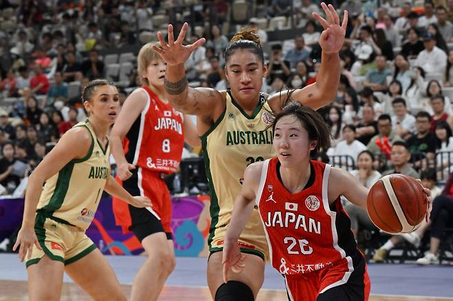 | ▲ 2025년 7월 20일 중국 남부 광둥성 선전에서 열린 2025년 FIBA 여자 아시아컵 농구 대회 호주와 일본의 마지막 경기에서 일본의 코코로 타나카(오른쪽)가 호주의 지티나 아오쿠소(오른쪽에서 두 번째)를 제치고 공을 드리블하고 있다. |