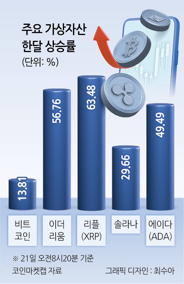 비트코인이 사상 최고가(12만2700달러)를 찍고 시가총액 상위 알트코인(비트코인 외 가상자산)이 한 달 새 50~60%대 급등하는 장밋빛 랠리 중이다.