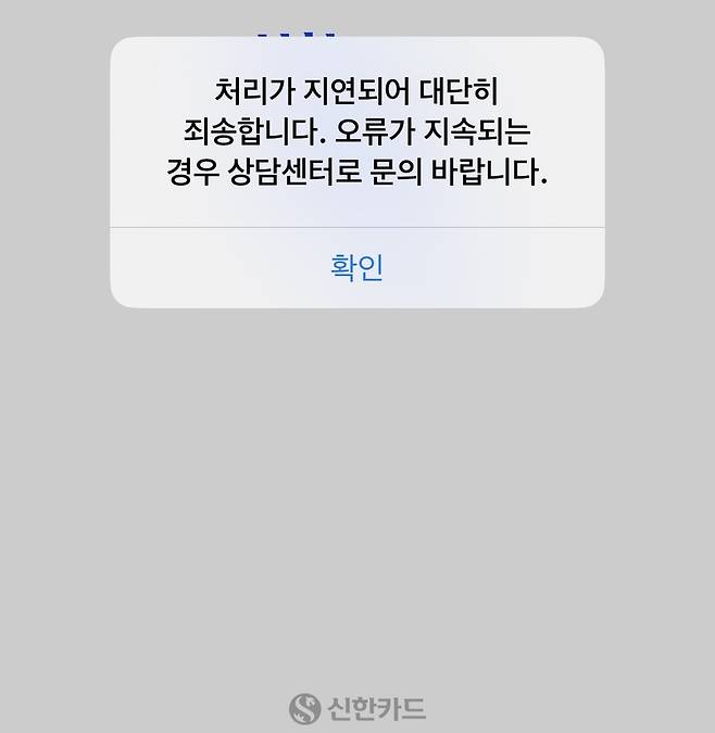 신한카드 앱 접속 시 "처리가 지연돼 대단히 죄송하다. 오류가 지속되는 경우 상담센터로 문의 바란다"는 안내 문구나 "네트워크 연결에 실패했다"는 등의 오류 문구가 뜨면서 앱이 자동 종료되는 현상이 발생하고 있습니다.