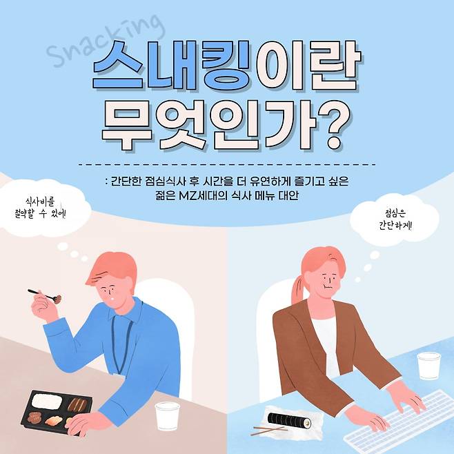 최근엔 트렌드가 달라졌다. MZ세대들 사이에선 직장 동료들과 다같이 점심을 먹기보다 나홀로 간단히 점심을 해결하고 나만의 시간을 가지려는 사람들이 많아지고 있다. 일명 스내킹(Snacking)족이다. 샐러드, 스낵 등 간편식으로 식사를 대체하는 것인데 고물가로 인한 점심 가격 부담을 덜기 위한 목적도 있다. 여의도, 광화문, 강남 등 주요 업무지구에서는 1만원으로 점심을 먹기도 힘들다는 이야기가 많다보니 스내킹족도 자연스럽게 늘고 있다.