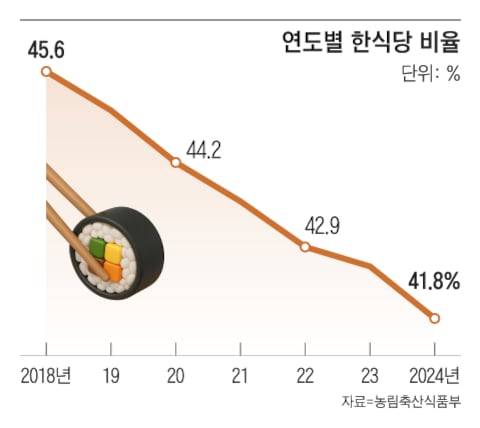 21일 농림축산식품부의 ‘외식업체 경영 실태 조사’(2024)에 따르면, 한식당 비율은 2018년 45.6%에서 2019년 45.0%, 2020년 44.2%, 2021년 43.6%로 줄었다. 이후에도 2022년 42.9%, 2023년 42.6%, 2024년 41.8% 등으로 매년 감소세를 보여왔다. 이런 추세가 계속된다면 3년 내로 이 한식 업종 비율은 30%대로 떨어질 전망이다.