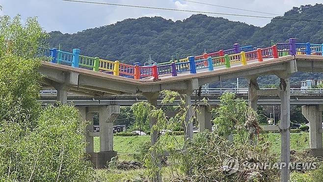(울산=연합뉴스) 김근주 기자 = 울산 '구 삼호교' 상판 일부가 21일 내려앉은 모습. 담당 지자체인 울산 중구는 최근 내린 많은 비로 교각이 약화하면서 지난 20일 상판이 침하한 것으로 추정한다. 2025.7.21
