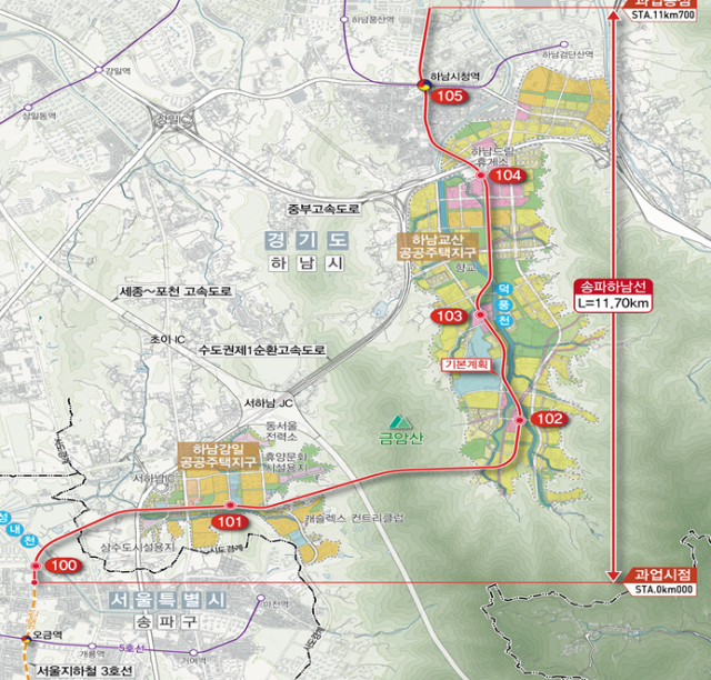 국토부에 따르면 송파하남선은 현재 운행되고 있는 서울지하철 3호선 '대화~오금' 구간을 하남시청역까지 연장하는 총 길이 11.7km의 광역철도 노선으로 기존 서울 도심과 하남 감일․교산 신도시를 경유한다.