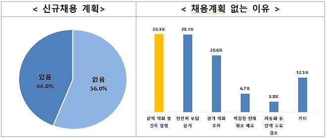 중견련 조사에 따르면 신규 채용계획이 없는 기업 중 28.3%는 '실적 악화'를, 28.1%는 '인건비 부담 증가'를 각각 이유로 꼽았다. '경기 악화 우려'로 답한 기업도 20.6%에 달했다.