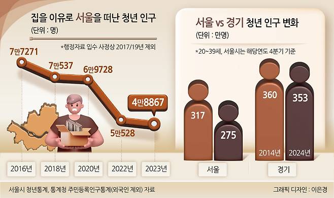 김 씨처럼 서울을 떠난 청년들은 경기, 인천 등 수도권으로 밀려났다. 2014~2024년 사이 주민등록상 서울의 청년인구는 13%(317만→275만) 줄었는데 이는 같은 기간 경기도는 2%(360만명→353만명) 감소하는데 그쳤다. 서울을 떠난 청년층이 상대적으로 주거 여건이 나은 경기권에 정착했음을 짐작할 수 있는 대목이다.
