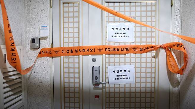 ▲ 21일 인천에서 사제 총기를 발사해 가족을 숨지게 한 피의자의 주거지에 폴리스 라인이 설치돼 있다.