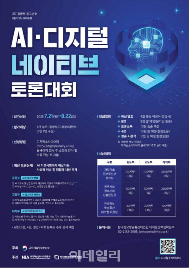 [이데일리 김현아 기자] 과학기술정보통신부(장관 배경훈)가 인공지능(AI)과 디지털 사회 전환을 주제로 한 청년 대상 ‘AI·디지털 네이티브 토론대회’와 ‘AI·디지털 논문공모전’을 개최한다. 이번 행사는 AI 시대를 살아갈 미래 세대의 시각에서 주요 이슈를 논의하고 정책적 상상력을 확장하는 장으로 마련됐다.