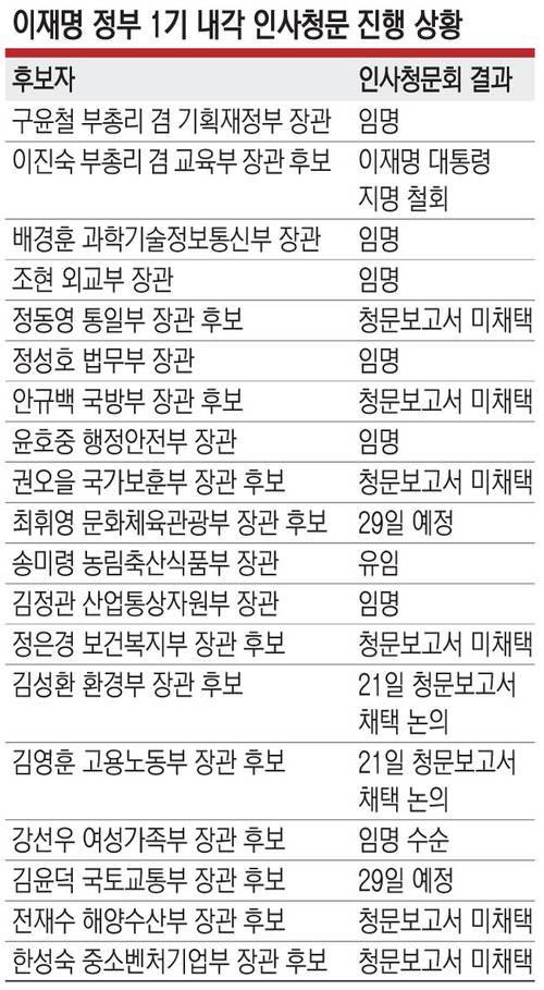 대통령실과 여당은 이 대통령이 강 후보자를 임명하기로 한 결정을 존중해야 한다고 맞섰다. 우상호 대통령실 정무수석은 이날 CBS 라디오에서 “(이 대통령이) 하루를 꼬박 고민하고 연락을 줬다”며 “저는 (이 대통령 결정에) 가장 영향을 많이 미친 것은 여당 지도부의 의견이었다고 판단하고 있다”고 말했다. 강 후보자와 관련한 판단이 앞으로 실제 임명하기까지의 과정에서 바뀔 가능성이 있느냐는 질문에는 “임명하니까 어제 발표를 한 것이다. 만약 임명 안 할 거면 왜 나눠서 발표했겠느냐”고 일축했다. 민주당은 야당의 반발에도 이날 김성환 환경부 장관 후보자와 김영훈 고용노동부 장관 후보자에 대한 인사청문 경과보고서 채택을 강행할 방침이다.