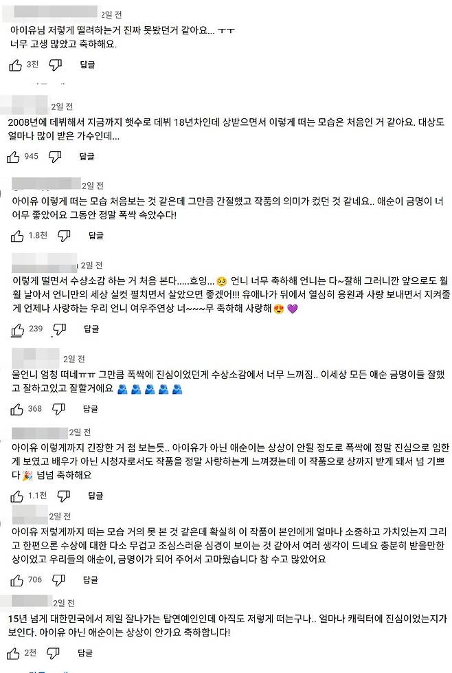 네티즌들은 "2008년에 데뷔해서 지금까지 햇수로 데뷔 17년 차인데 상 받으면서 이렇게 떠는 모습은 처음인 거 같다. 대상도 얼마나 많이 받은 가수인데", "아이유 님 저렇게 떨려 하는 거 진짜 못 봤던 거 같아요", "아이유 이렇게 떠는 모습 처음 보는 것 같은데 그만큼 간절했고 작품의 의미가 컸던 것 같네요", "15년 넘게 대한민국에서 제일 잘나가는 탑 연예인인데 아직도 저렇게 떠는구나.. 얼마나 캐릭터에 진심이었는지가 보인다. 아이유 아닌 애순이는 상상이 안 간다", "아이유 저렇게까지 떠는 모습 거의 못 본 것 같은데 확실히 이 작품이 본인에게 얼마나 소중하고 가치 있는지 알 것 같다" 등 놀란 반응을 보였다.