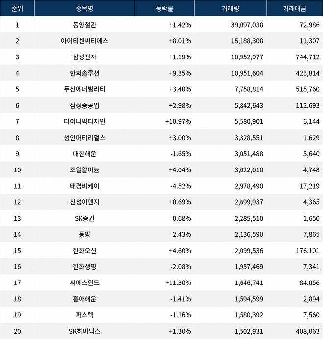 한편 거래량 상위 20위권 종목들은 태경비케이(014580) ▼4.52%, 신성이엔지(011930) ▲0.69%, SK증권(001510) ▼0.68%, 동방(004140) ▼2.43%, 한화오션(042660) ▲4.60%, 한화생명(088350) ▼2.08%, 씨에스윈드(112610) ▲11.30%, 흥아해운(003280) ▼1.41%, 퍼스텍(010820) ▼1.16%, SK하이닉스(000660) ▲1.30% 등의 성적을 기록하고 있다.