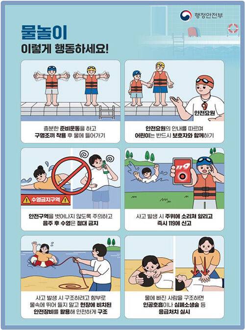 행정안전부는 여름방학과 휴가가 시작되는 7월 하순 물놀이 사망 사고가 가장 자주 발생한다며 구명조끼 착용 등 물놀이 사고 예방수칙 준수를 당부했습니다.
