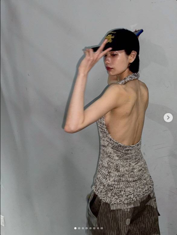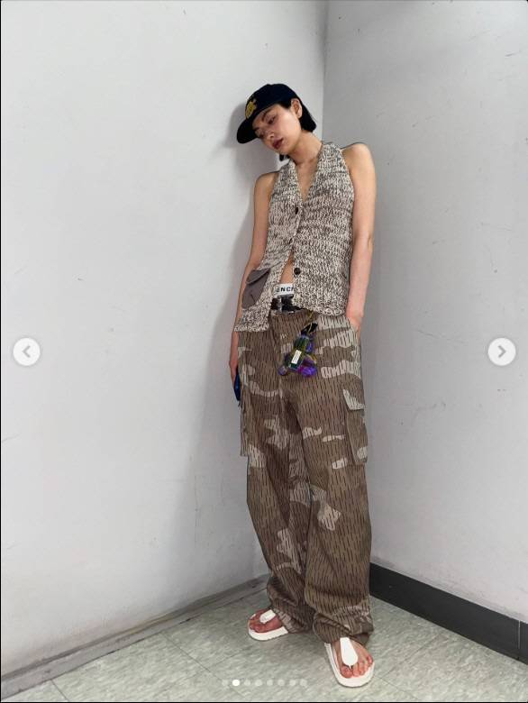 특히 뒷모습에서는 등이 고스란히 드러나며 강렬한 인상을 남겼고, 정면에서는 바지 위로 언더웨어 밴드가 노출되며 트렌디한 힙한 무드가 더해졌다.