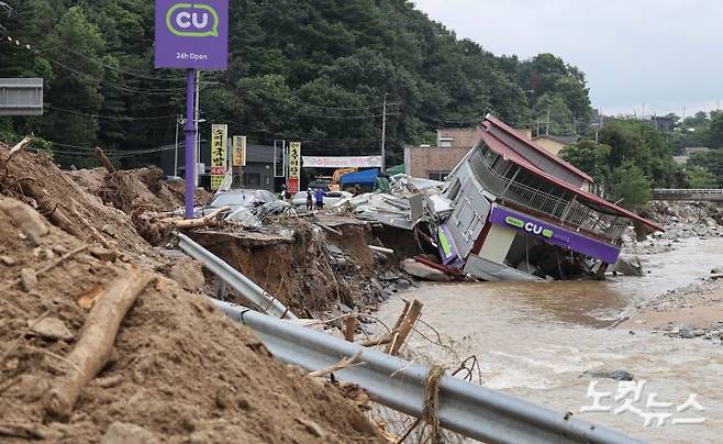 21일 경기 가평군 조종면 십이탄천 인근 한 건물이 집중호우로 인해 무너져 있다. 가평 조종면에는 전날 오전 3시 30분을 전후해 시간당 76㎜의 폭우가 쏟아지는 등 이날 하루 누적 강수량 200㎜를 기록하는 물폭탄이 쏟아졌다.