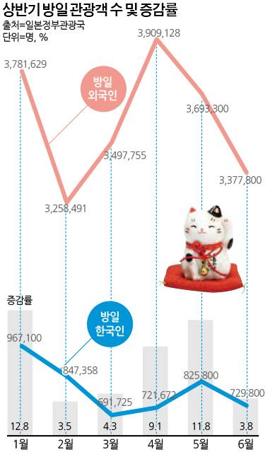 상반기 일본을 방문한 한국인 관광객 수는 478만3,455명으로 전년동기(444만2,111명)대비 7.6% 증가했다. 단순 계산으로도 지난해 방일 한국인 수 약 880만명을 가볍게 넘어서고, 연간 1,000만명 기록에도 도전할 만한 수준이다. 이는 상반기 방일 관광객 수 1위 기록이기도 하다.